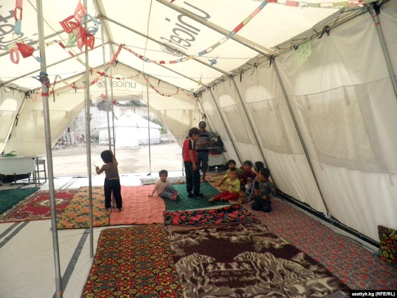 Кара-Суу районуна караштуу Шарк айылындагы Толстой орто мектебинин окуучулары үчүн өрттөнүп кеткен мектептин жанында эски автобазага 12 чатыр тигилди