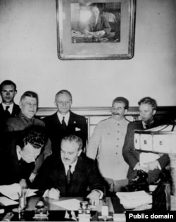 Фашисттик Германиянын тышкы иштер министри Иоахим фон Риббентроп, СССРдин жолбашчысы Иосиф Сталин жана СССРдин тышкы иштер министри Вячеслав Молотов эки тараптуу келишимге кол коюу жөрөлгөсү маалында. Кремл, Маскөө. 1939-жылдын 23-августу
