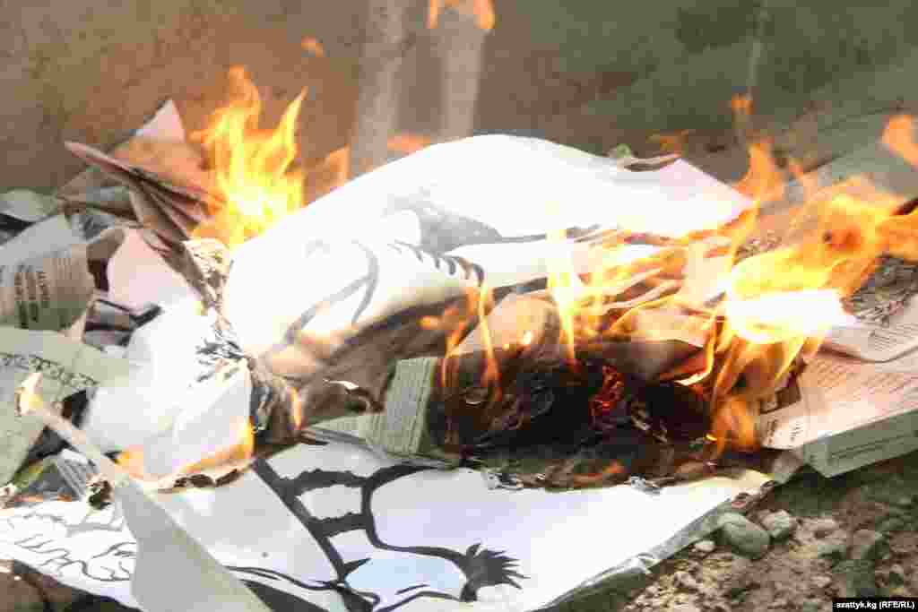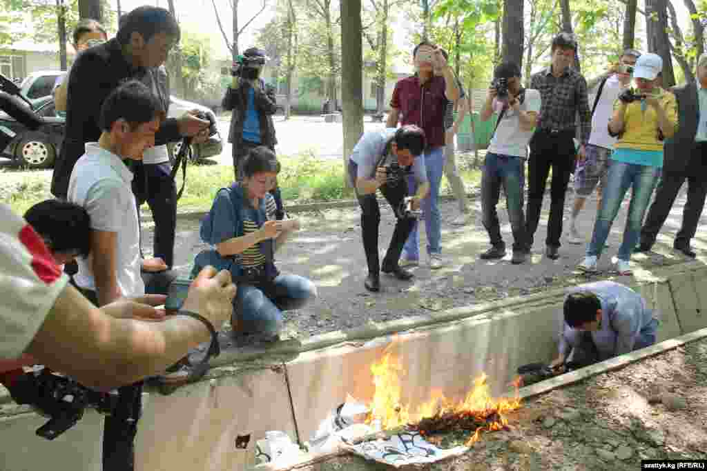 Флеш-моб жүрүшүндө журналисттер бакчадагы өрдөктөрдү, кумалактарды чогултуп өрт коюшту. Алар бул акция аркылуу символикалуу түрдө кыргыз журналистикасын жалган маалыматтардан, ушак-айыңдардан арылтышты.