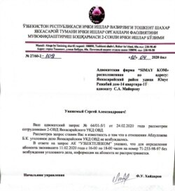 "Азаттыктын" өзбек кызматынын маалыматына караганда, Абдуллаев Бишкекте жүргөн маалда анын Ташкенттеги адвокаты Сергей Майоров Ташкенттин Яккасарай райондук ички иштер бөлүмүнө жана Өзбекстандын коопсуздук кызматына кат жиберип, Абдуллаевге эч кандай кылмыш иши козголбогону тууралуу маалымат алган.