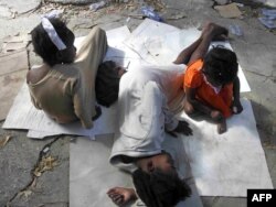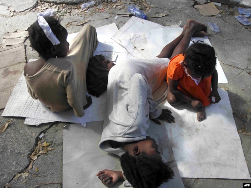 Зилзаладан соң сыртта эч алып отурган үч бала. Порт-о-Принс. 14-январь