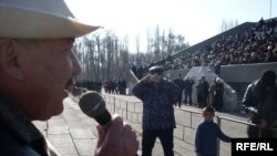 Эл ичиндеги акындар Кыргызстанда акыркы кезде болуп жаткан саясий кырдаал тууралуу өз ырларын окуп жатышты. Алардын бири жерлерди бийлик башчылар башка мамлекеттерге мыйзамсыз берип жатканы тууралуу мындай ырын окуду.