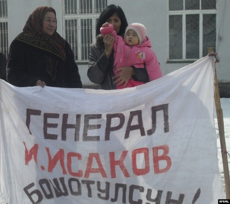 Гүлчө кыштагында, Алай райондук акимчилигинин алдында, мурдагы коргоо министри Исмаил Исаковдун жүзгө жакын таламдашы чогулуп, азыркы бийликти генералды ак жеринен каматкандыгы үчүн катуу айыпташты.