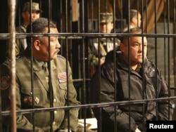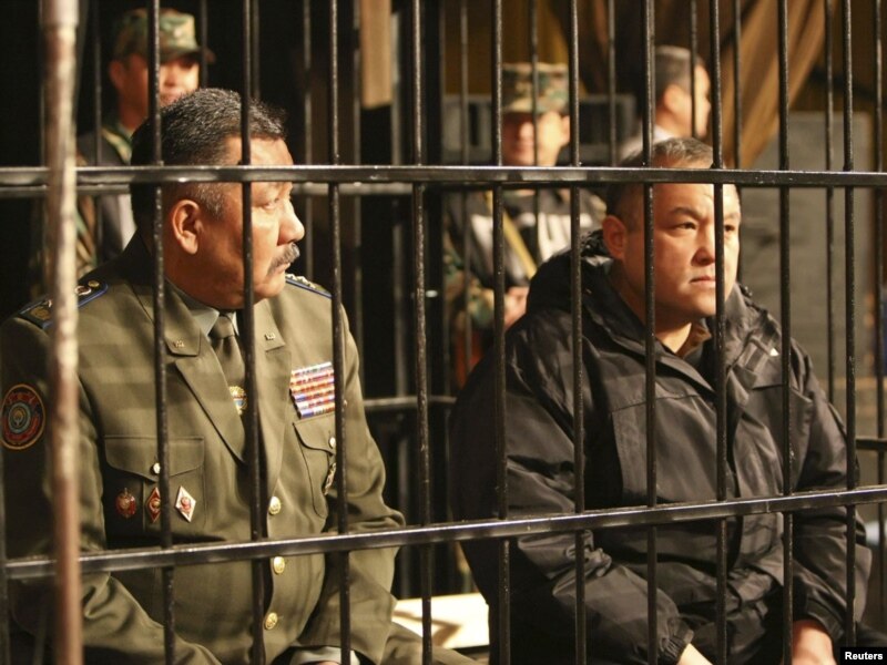 Айыпталуучулар сот залында: мурдагы коргоо министри Бакыт Калыев (оңдо) жана Мамлекеттик күзөт кызматынын жетекчисинин мурдагы биринчи орун басары Нурлан Темирбаев (солдо).