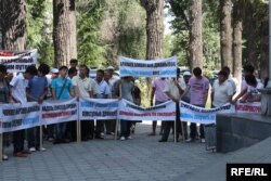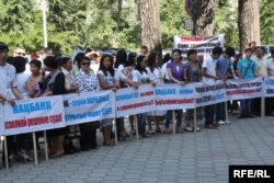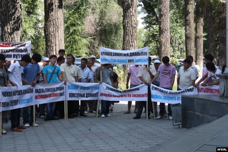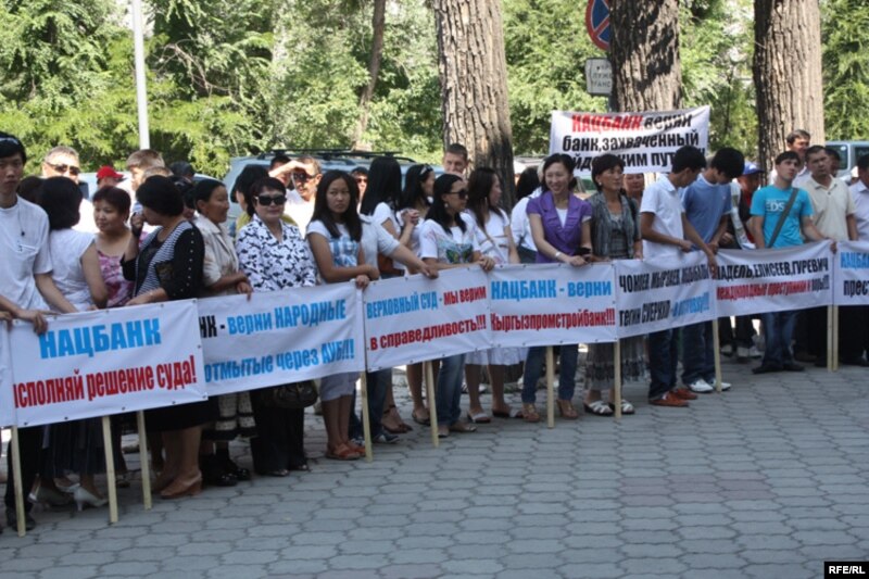 Убактылуу өкмөттүн кезектеги декрети менен “Азия Универсал банкы” улутташтырылып “Кыргызөнөржайкурулуш” банк тагдыры арасат калышына капа болгон банктын акционерлери менен мурдагы кызматкерлери нааразылык иш-чарасына чыкты, 5-июль.