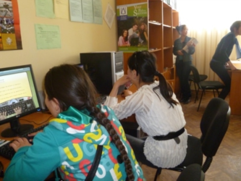 Кыргызстанда чет тилдерге кызыккан жаштардын саны артып барат. Билим берүү борборунда англисче TOEFL сынагына даярдоо сабагына катышып жаткан кыздар. Нарын ш., 2011-ж.