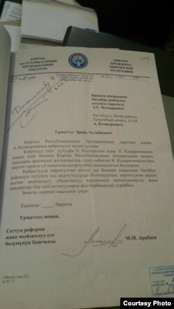 Ал арада “Азаттыктын” редакциясына президенттик апараттын соттук реформа жана мыйзамдуулук бөлүмүнүн башчысы Манас Арабаевдин бул ишке түздөн-түз кийлигишкенин күбөлөндүргөн кат келип түштү. Арабаевдин колу коюлган кат иш каралып жаткан Октябрь райондук сотунун төрагасы Эрнис Чоткараевге жөнөтүлгөн.​