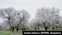 Кабарчыбызга Кадамжай районуна караштуу Ак-Турпак айыл аймагынын тургуну Садыбакас Мадымаров тоонун этегиндеги бозоргон жантыктагы оазистей болуп көзгө чакчайып көрүнүп турган, тегиз баары мөмө алган өрүкзарды көрсөтүп күйүп бышып жатты.