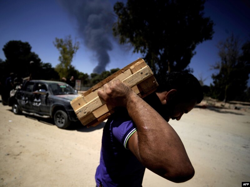 Козголоңчу Триполинин түштүк четиндеги ал-Масер токоюнан табылган куралдарды көтөрүп баратат. 25-август, 2011