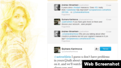 “Озодлик” ("Эркин Европа/Азаттык" үналгысынын өзбек кызматы) жогору жактан Гүлнара Каримованын атын каралоого түз буйрук алган” деген ойду  @meclarck деген колдонуучу жазган, аны Гүлнара Каримова ретвиттеген.