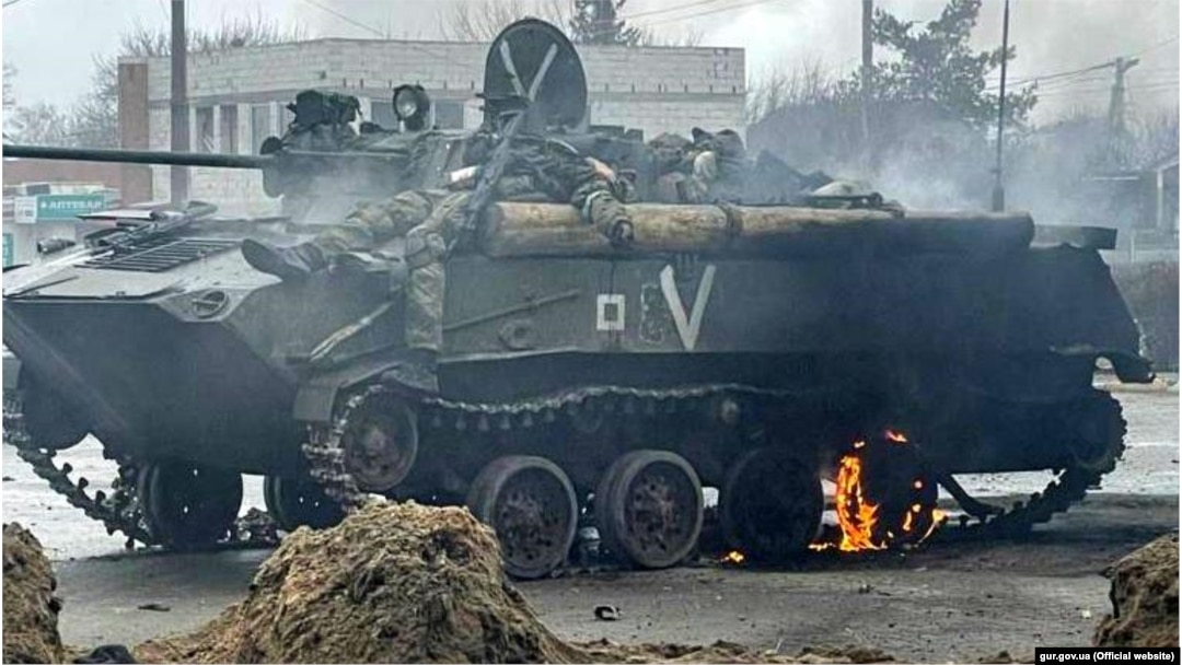 Украиналык жоокер Киевдин жанындагы Дмитровка кыштагында орусиялык танктарды талкалагандан кийин орус аскер бөлүгүнүн белгисин көрсөтүп турат. 2-апрель, 2022-жыл.